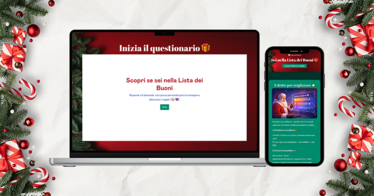 6 domande, risultato immediato 😇/😈 e email automatica con il “regalo”.
